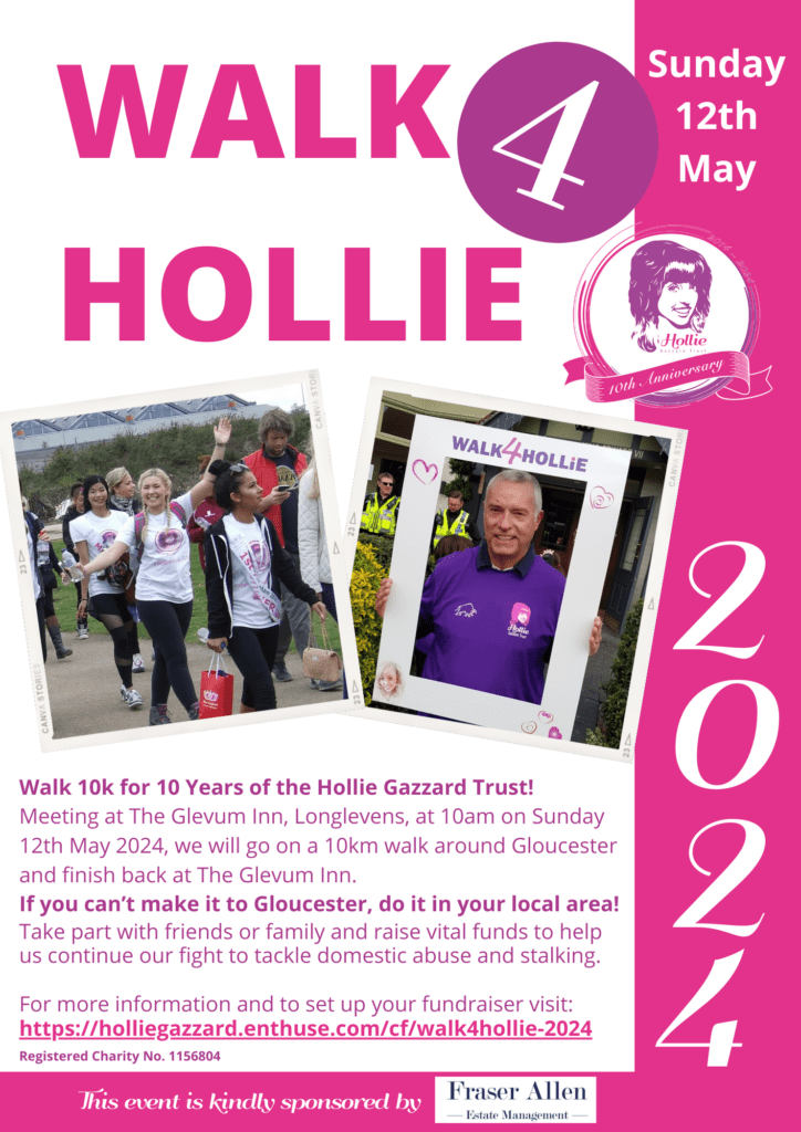 We are delighted to launch Walk4Hollie 2024 which will take place on Sunday 12th May 2024. The walk is an opportunity to come together to reflect and remember those taken too soon by domestic abuse, stalking and knife crime. This event is kindly sponsored by Fraser Allen Estate Management.